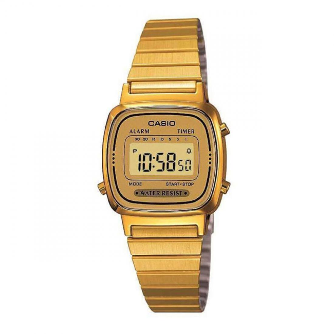 Casio Vintage LA670WEGA-9EF je ženski digitalni sat koji se ističe elegantnim i vintage dizajnom. Zlatno kućište i metalna narukvica pružaju mu sofisticiran izgled, čineći ga sjajnim modnim dodatkom. Digitalni prikaz omogućava jednostavno čitanje vremena, a različite funkcije poput alarma, kalendara i stoperice čine ga praktičnim i funkcionalnim. Ovaj sat ima klasičan izgled s modernim dodirima, što ga čini savršenim za žene koje vole spoj retro stila i suvremene funkcionalnosti. Kopča na narukvici osigurava udobno nošenje, čineći ovaj Casio sat idealnim za svakodnevnu upotrebu.