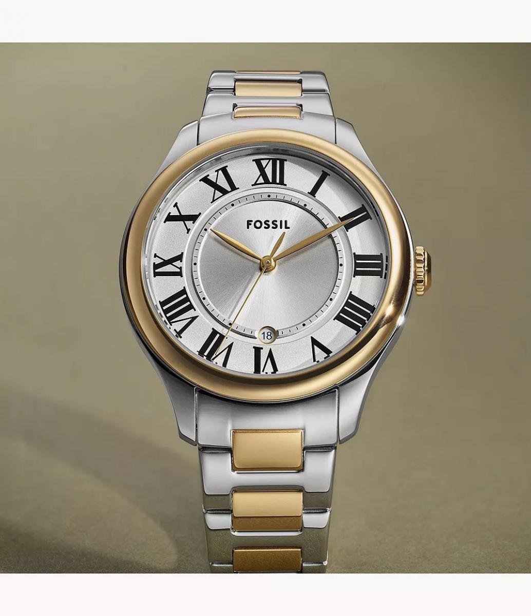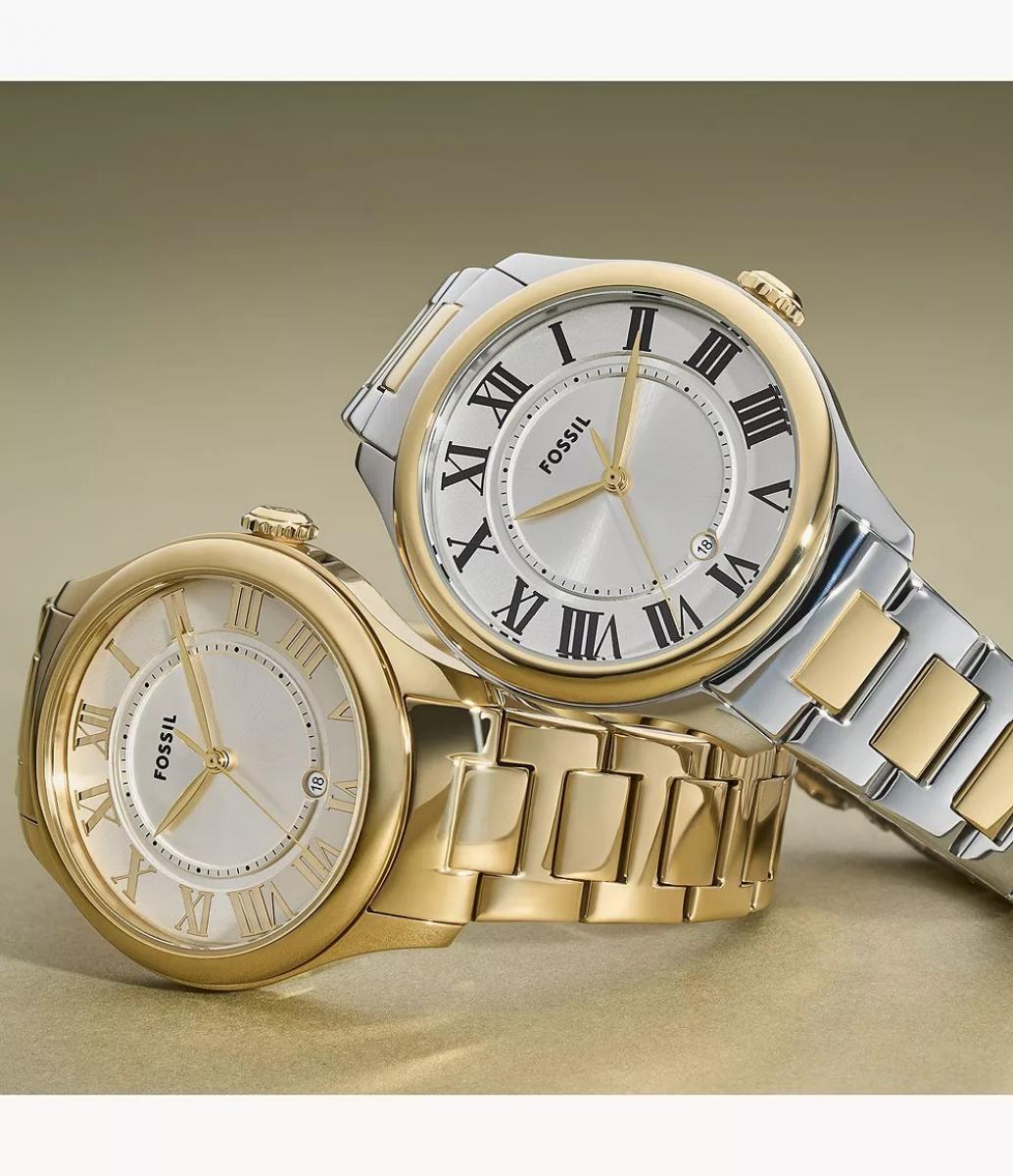 Fossil iz kolekcije Gilmore ES5396 odiše suptilnom elegancijom i lako se uklapa u svakodnevne, a i formalne prilike. Dvoslojni dizajn u zlatnim i srebrnim tonovima daje mu klasičan i luksuzan izgled koji se dobro pristaje uz nakit. Tanak profil i reflektujući brojčanik čine ga idealnim izborom za poslovne sastanke, a i večernje izlaske. Savršen je kao promišljen poklon koji ostavlja utisak bez previše riječi.