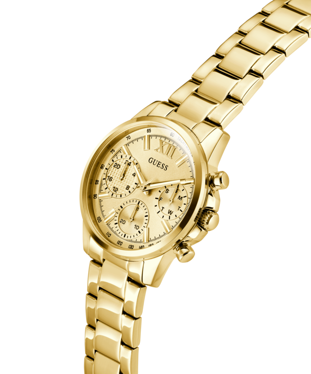Zlatno kućište promjera 36 mm i polirana narukvica od nehrđajućeg čelika daju ovom modelu elegantan i profinjen izgled. Champagneni sunray brojčanik unosi toplu nijansu i suptilan sjaj dok višefunkcionalni dizajn osigurava praktičnost u svakodnevnom nošenju i stilsku notu za posebne prilike.