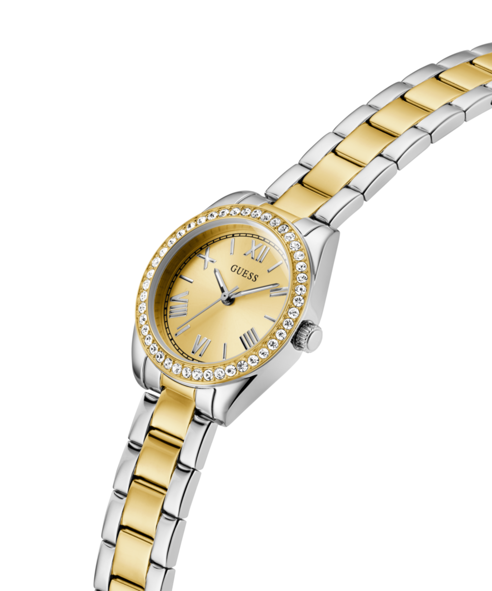 Mini verzija klasičnog dizajna donosi kompaktan i skladan izgled. Prsten sata ukrašen kristalima, čist brojčanik i elegantna narukvica stvaraju uravnotežen stil koji se lako uklapa u svakodnevne i posebnije kombinacije.
