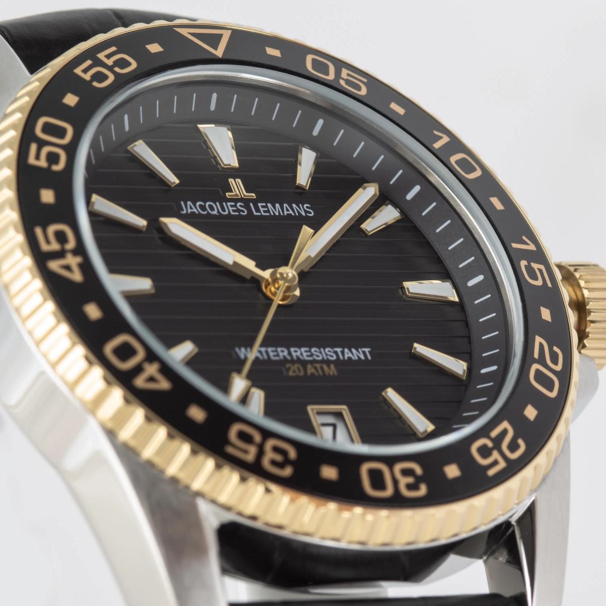 Jacques Lemans 1-2205G pripada kolekciji Liverpool Diver i predstavlja muški sat koji spaja sportski karakter, a sofisticiran stil. Crni brojčanik sa zlatnim akcentima daje mu prepoznatljiv i luksuzan izgled koji privlači poglede, a istovremeno ostaje besprekoran za svakodnevne kombinacije. Pažljivo oblikovan okvir i udobna narukvica čine ga prijatnim za nošenje tokom cijelog dana. Savršen je izbor za poklon ili kao modni detalj koji ističe dobar ukus.