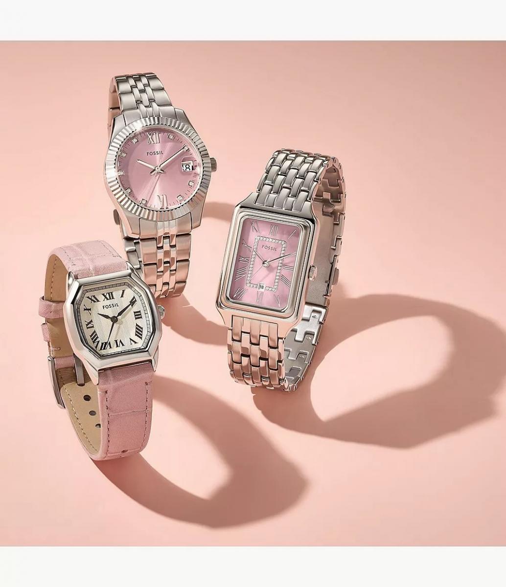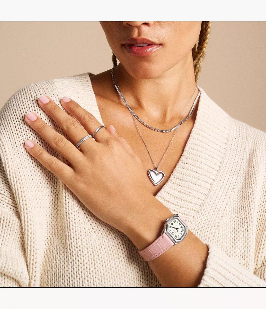 Ovaj sat iz kolekcije Harlow odiše suptilnom elegancijom, a nježna ružičasta narukvica unosi ženstven šarm. Oktagonalni oblik kućišta i kremasti brojčanik stvaraju profinjen retro dojam, a istovremeno pristaju modernim kombinacijama. Savršen je dodatak za dnevne gradske izlaske, a jednako dobro će istaknuti i večernji styling. Izvrsna je opcija za poklon koji ostavlja dojam ukusa i pažnje.