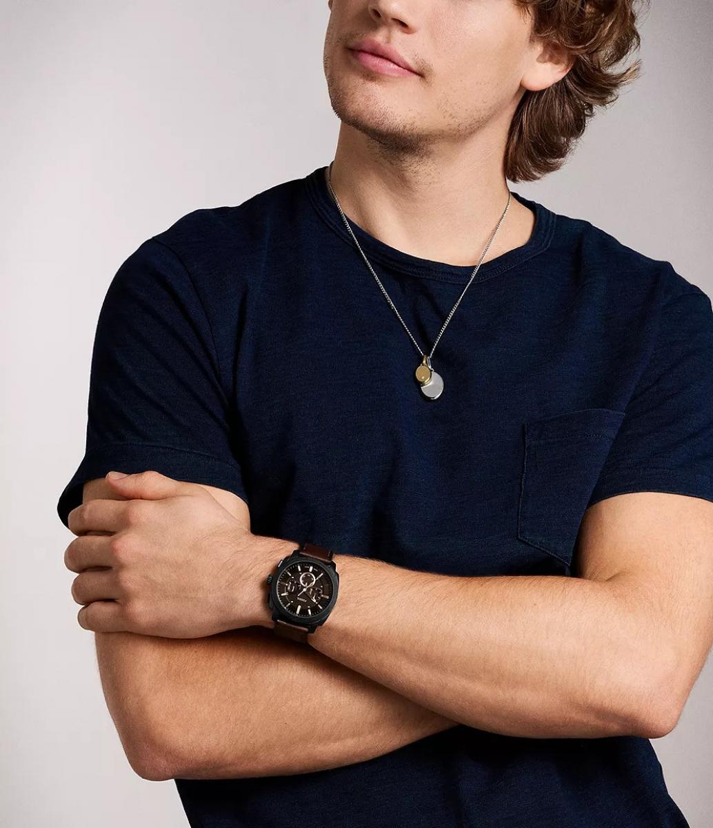 Fossil Machine FS6101 ostavlja snažan dojam zahvaljujući industrijskom dizajnu i upečatljivoj teksturi prstena. Tamno smeđi ton brojčanika i diskretna pažljivo izrađena narukvica daju mu toplinu, a istovremeno zadržavaju muževnu eleganciju. Savršen je za poslovne sastanke, a i za ležerne večernje izlaske kada želite da vas primijete bez previše pompeznosti. Pripada kolekciji Machine i predstavlja izvrsnu opciju kao stilski poklon za posebne prilike.