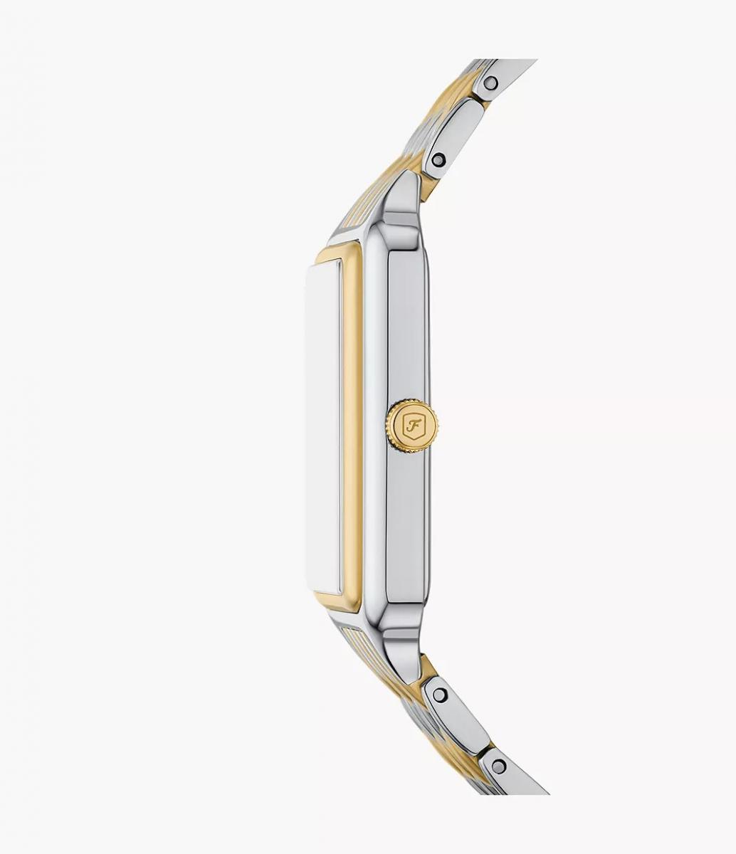 Ovaj ženski sat odiše profinjenom elegancijom i modernim stilom. Pravougaono kućište i narukvica od čelika, u kombinaciji srebra i zlata, daju mu univerzalan i sofisticiran izgled. Svijetli brojčanik s prikazom dana/noći i diskretnim detaljima omogućava jasan prikaz vremena, dok kvarcni mehanizam i otpornost na vodu (5 ATM) čine sat pouzdanim za svakodnevno nošenje. Udoban i tanak, idealan je kao modni dodatak za dnevne, poslovne ili večernje prilike.