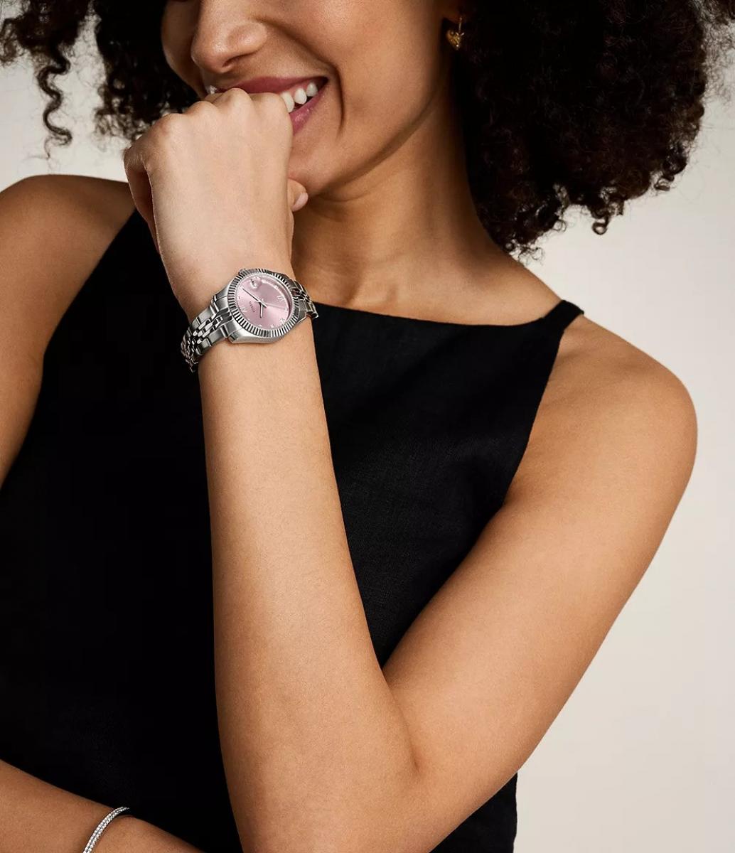 Fossil Scarlette ES5403 iz kolekcije Scarlette spaja suvremenu eleganciju i svakodnevnu nosivost. Ružičasti sunray brojčanik unosi toplinu i sofisticiranost, a rebrasti rub dodaje diskretan detalj koji privlači poglede. Dizajn je profinjen i podiže svaki dnevni outfit te predstavlja odličan izbor za poklon.