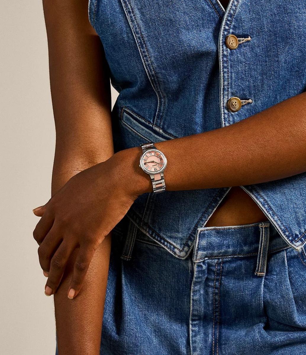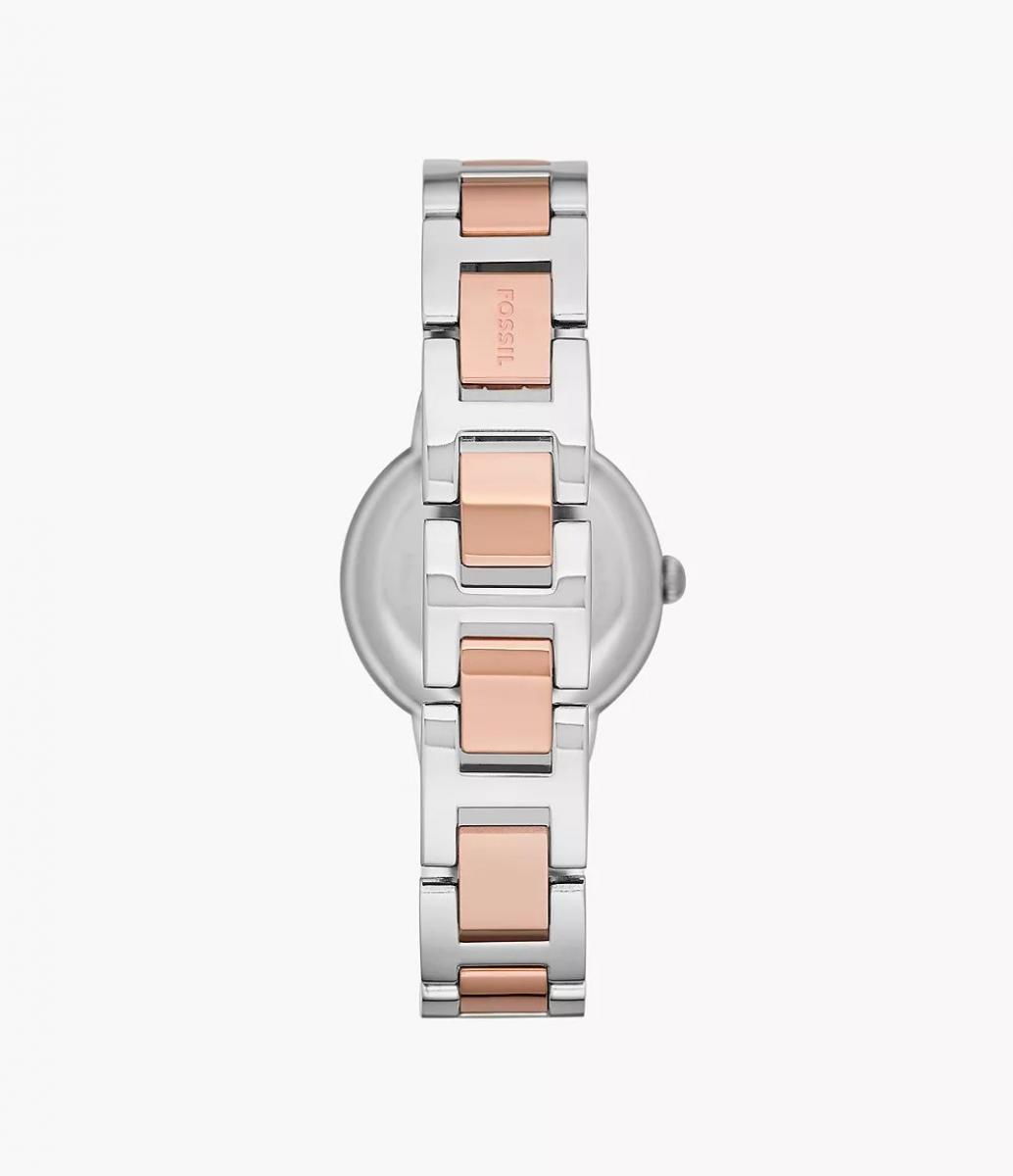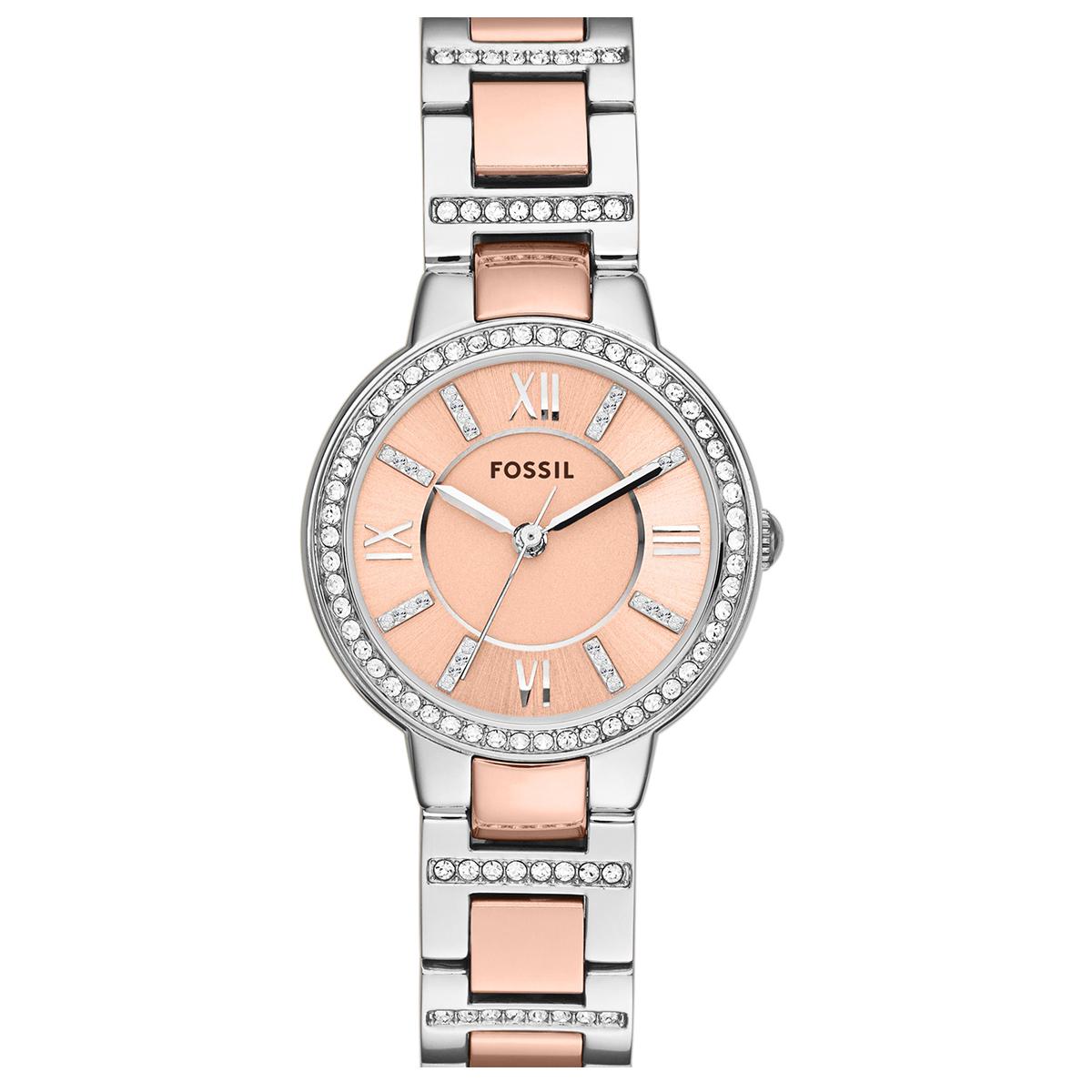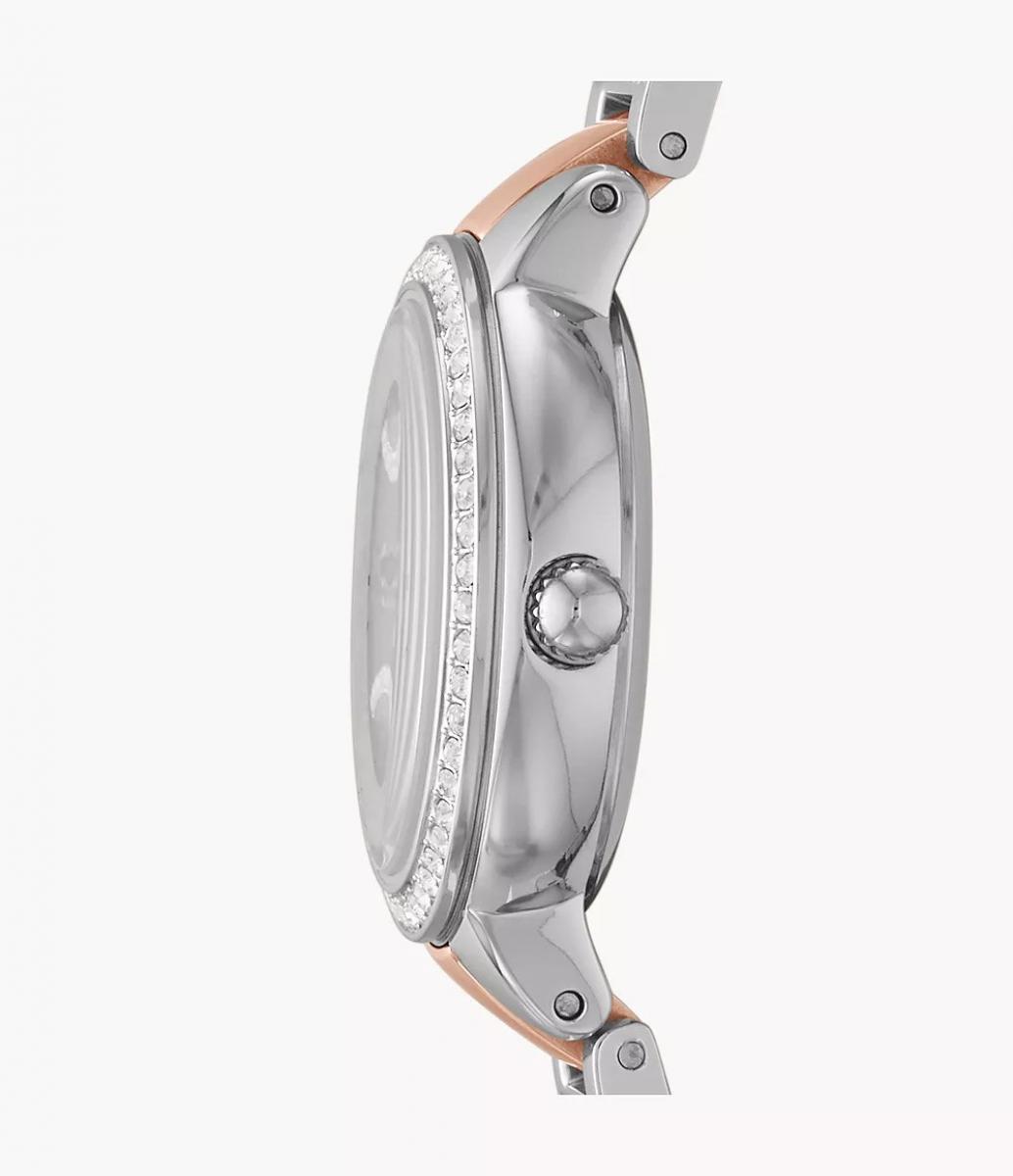 Elegantan ženski sat iz Fossilove Virginia kolekcije koji spaja klasičnu sofisticiranost, a blistavi kristali na bezelu dodaju mu diskretan glamur. Dvodijelni spoj srebrnih i roze zlatnih tonova čini ga svestranim modnim detaljem koji pristaje poslovnim, a i večernjim kombinacijama. Fini cifernik u roze zlatnoj nijansi i tanak profil narukvice daju ženstven izgled koji ističe ukus bez preglasnog izričaja. Savršen je kao poklon za posebne prilike, a i kao svakodnevni dodatak koji podiže cjelokupan stajling.