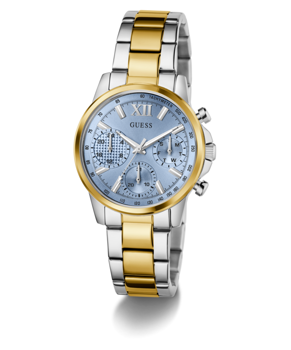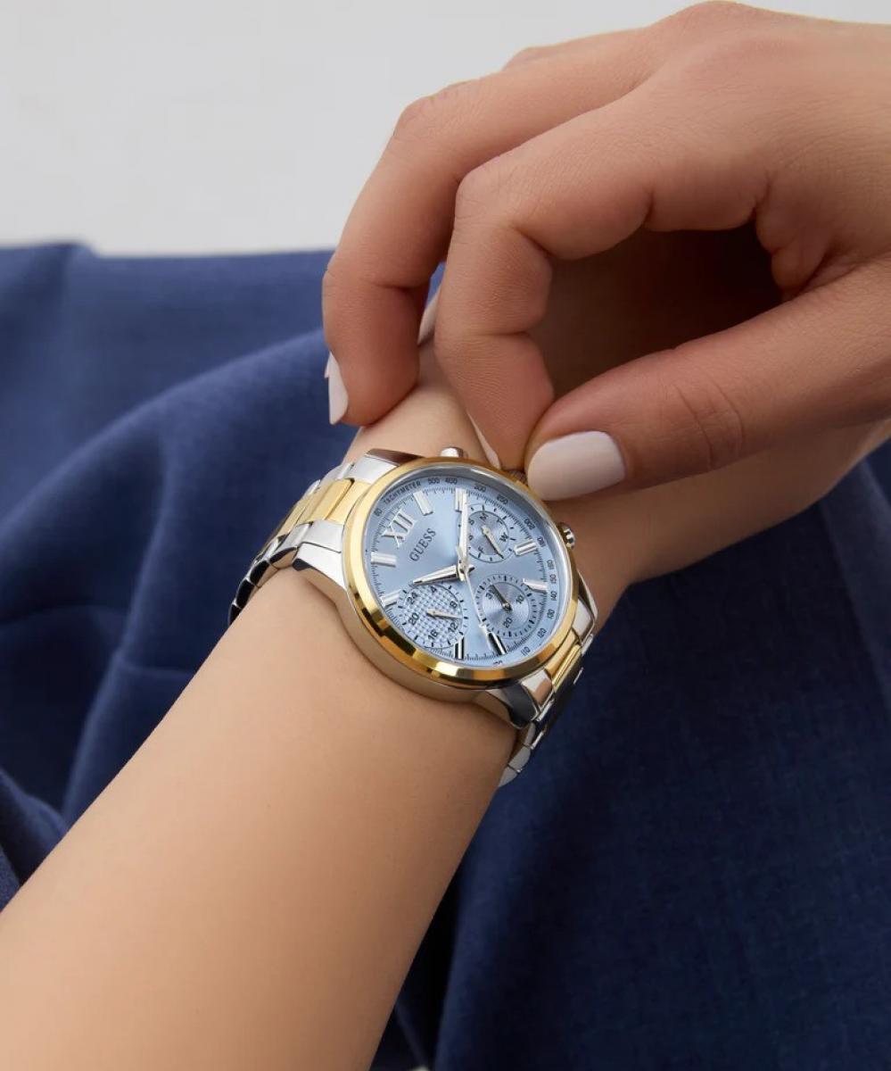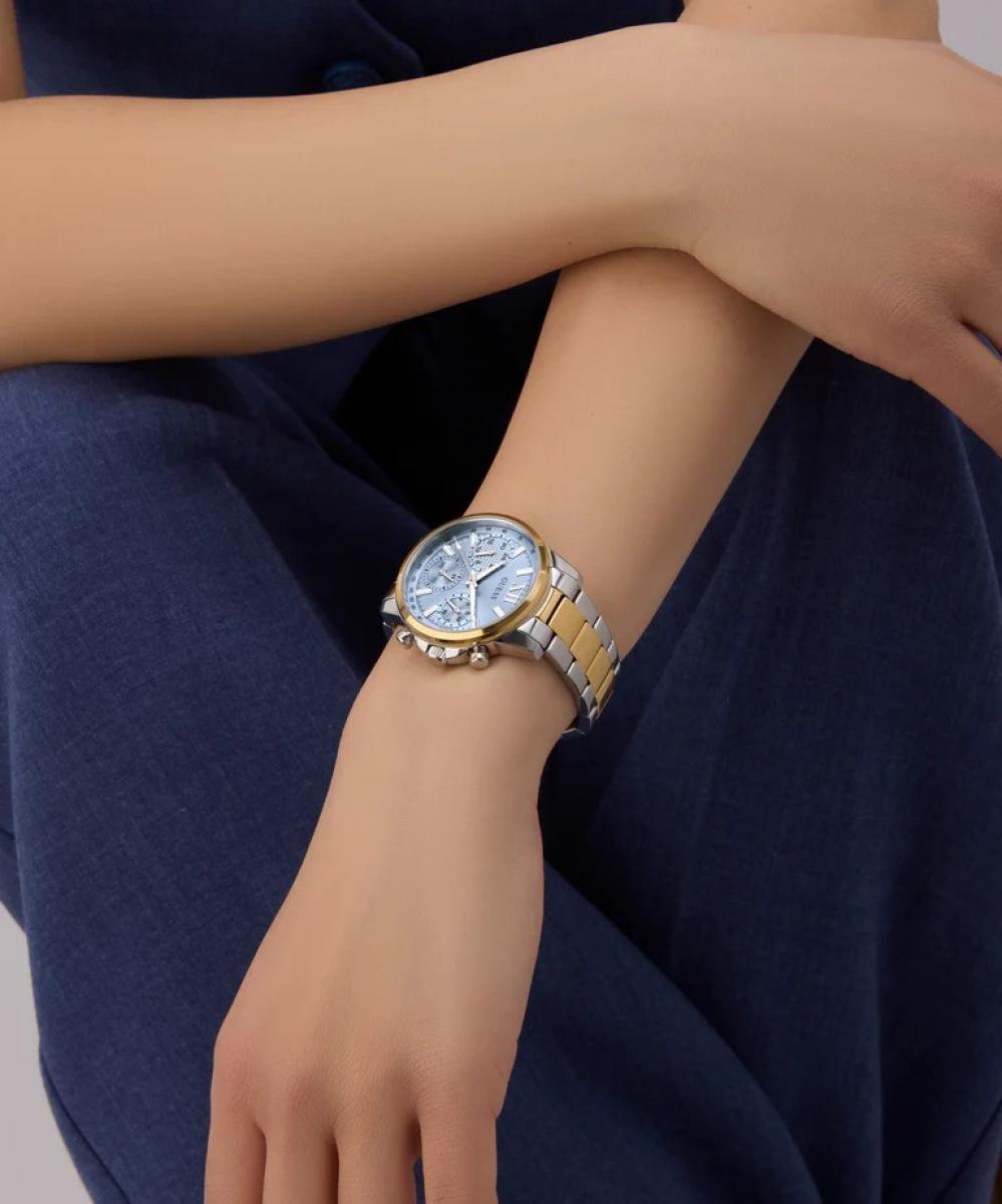 Kućište promjera 36 mm u kombinaciji srebra i zlata zajedno s poliranom narukvicom od nehrđajućeg čelika daje ovom modelu elegantan i moderan izgled. Ledenoplavi sunray brojčanik unosi svjež i profinjen naglasak dok višefunkcionalni dizajn osigurava praktičnost u svakodnevnom nošenju ali i dovoljno stila za posebne prilike.