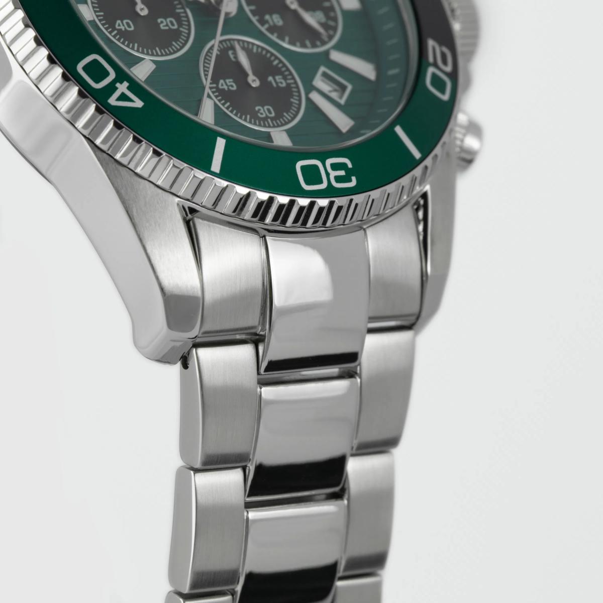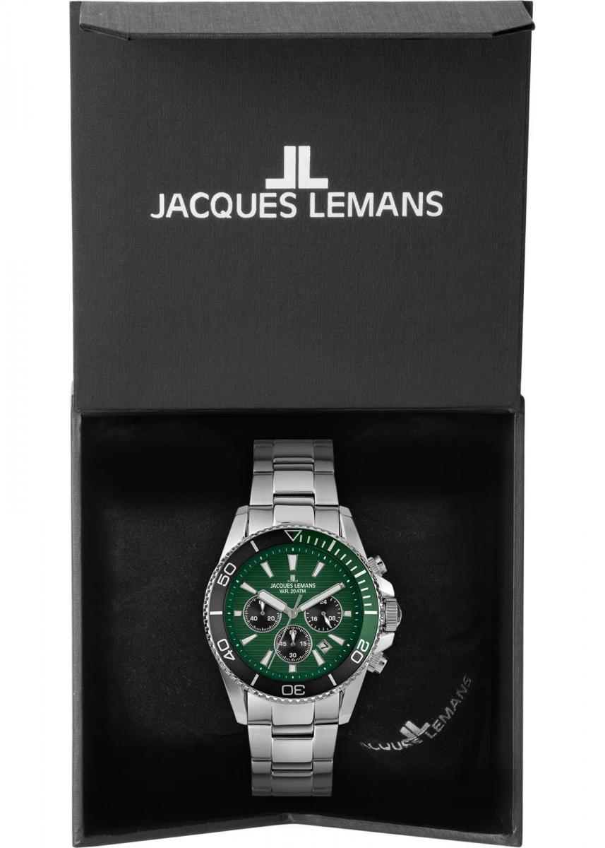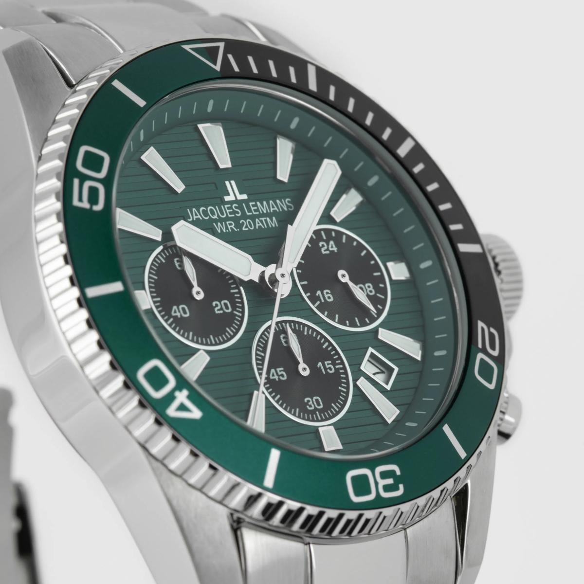 Jacques Lemans iz kolekcije Liverpool Diver je muški sat koji odaje sportsku eleganciju i samopouzdanje. Bogati zeleni brojčanik u kontrastu sa svijetlim kućištem stvara upečatljiv, a sofisticiran izgled koji privlači poglede. Dizajn je dovoljno svestran za svakodnevno nošenje, a istovremeno se izdvaja na važnim prilikama. Savršen je izbor za muškarce koji žele sat koji govori o stilu bez pretjerivanja.