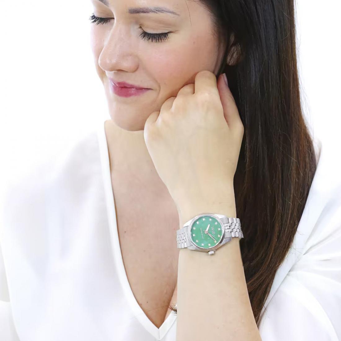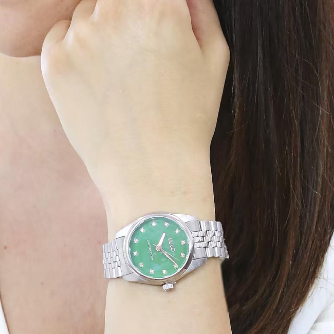 Liu Jo ženski sat s upečatljivim zelenim brojčanikom koji odmah privlači poglede. Elegantnog i suptilnog dizajna koji njeguje urbani stil, savršeno pristaje poslovnim kombinacijama, a jednako dobro naglašava i ležerni stajling. Diskretna narukvica daje sofisticiran izgled bez pretjeranog sjaja, pa sat ostaje istančan, a ne nametljiv dodatak. Idealan je poklon za posebne prilike kada želite da ostavite trajan utisak.