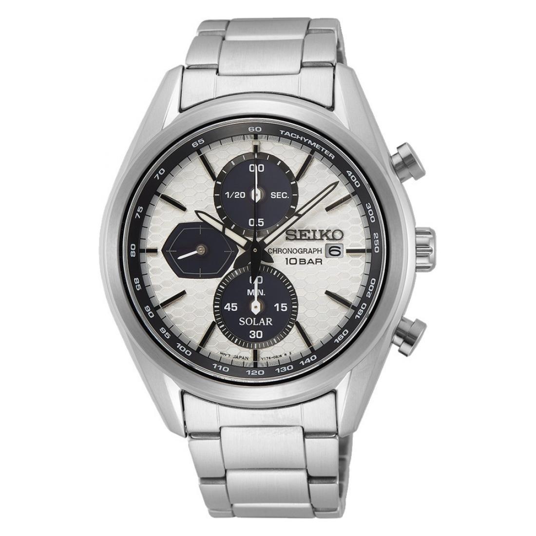 Spoj tehnologije i preciznosti, Seiko Solar Chronograph koristi solarnu energiju za dugotrajno i pouzdano mjerenje vremena. Opremljen funkcijama kronografa, ovaj sat nudi vrhunsku funkcionalnost i moderan dizajn, savršen za aktivan i dinamičan životni stil. Bez potrebe za čestom zamjenom baterije, pruža udobnost i ekološku osviještenost.